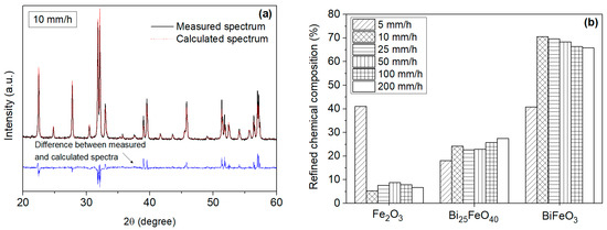 To substantiate this interpretation, the chemical composition of the prepared samples was estimated by Rietveld’s refinement method using Profex [21]. Figure 2a shows the measured and calculated spectra for the sample grown at 10 mm/h, and Figure 2b presents the evolution of the percentage, in volume, of the identified phases with the increase in the growth speed.