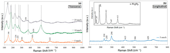 (a) Raman spectra of the transverse cross-section of the fibers grown at 5 mm/h, 10 mm/h, and 25 mm/h; (b) Raman spectrum of the longitudinal cross-section of the fiber grown at 5 mm/h (inset: Raman spectrum of Fe2O3, adapted from [24]).