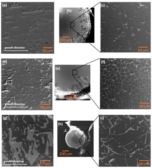 Figure 4 shows typical SEM micrographs of the fibers grown at 5, 10, and 25 mm/h. The images were taken on the longitudinal section of the fibers (Figure 4a,d,g) and in the transverse cross-section (Figure 4b,c,e,f,h,i) obtained after polishing the fibers. The micrographs also show the growth direction of the fibers, which is represented by an arrow placed in the images corresponding to the longitudinal section. The images obtained are consistent with the analyses carried out previously since they reveal a polyphasic character, with BiFeO3 being the major phase (darker phase) and Bi25FeO40 being the main secondary phase (lighter phase), for samples 25 and 10 mm/h. This identification was based on the elemental quantification measurements made by EDS and is in accordance with reference [29], since the less refractory phases are the bismuth-richer phases that correspond to the lighter phases in SEM micrographs. In the present study, Bi25FeO40 is the less refractory phase.
