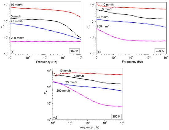 Frequency dependence of the dielectric constant, measured at (a) 150 K, (b) 300 K, and (c) 350 K, for the fibers grown at 5, 10, 25, and 200 mm/h.