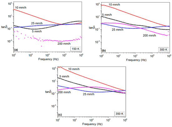 Frequency dependence of the loss tangent, measured at (a) 150 K, (b) 300 K, and (c) 350 K, for the fibers grown at 5, 10, 25, and 200 mm/h.