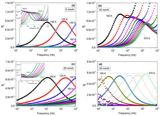 Imaginary part of the modulus, M″, as a function of frequency, for temperatures between 100 and 370 K, in steps of 10 K, for the fibers grown at (a) 5 mm/h; (b) 10 mm/h; (c) 25 mm/h; (d) 200 mm/h.