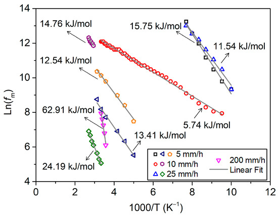 where fm is the frequency at the relaxation peak, f0 is a pre-exponential factor, Ea is the activation energy, kB is the Boltzmann constant, and T is the absolute temperature.