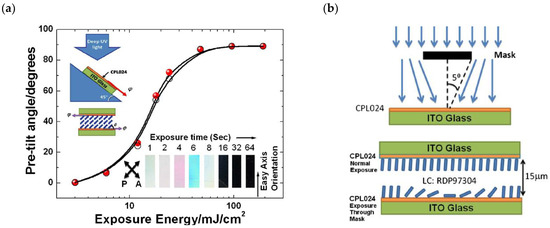The bottom inset of Figure 1a represents microphotographs of an LC cell with different pretilt angles vs. the exposure time (s). Thus, spatially changing UV irradiance is effective for obtaining any desired pattern.