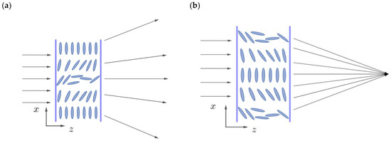 On the basis of the saturated dependence shown in Figure 1a, it is clear that the center of the photosensitive surface of a diverging lens must absorb lower exposure energy than the outer areas. As a result, the radial distribution of the director has the form, which is depicted in Figure 2a. If one irradiates the surface in the center with higher intensity than at the periphery, the resulting surface corresponds to a converging lens (see Figure 2b). Once the surfaces are properly treated, the application of voltage to ITO-coated substrates leads to a change in the LC director configuration.