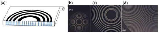 Photonic crystals represent highly organized structures with submicron-scale periodicity. Current fabrication techniques are emerging at a fast pace; however, manufacturing large monocrystals still remains a challenge, and further work is necessary to achieve the precise orientation of large crystals. A way to solve this problem is to apply micropatterned photonic LC fibers. These fibers represent versatile optical waveguides with different geometries. D. Budaszewski et al. considered the application of photoaligned FLCs as functional materials to achieve quick electro-optic response in periodically arranged micro-channels. The fibers can be arranged in several ways, and an example of such geometry is shown in Figure 9a [48,49].