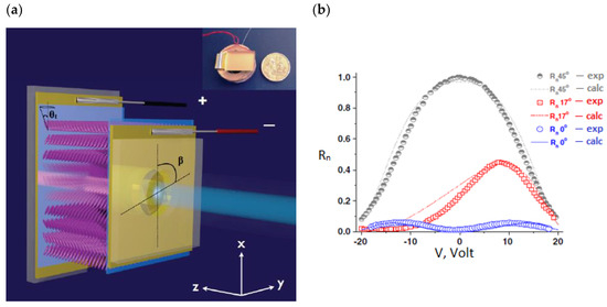 Recent advances in nanomaterials, nanofabrication, and methods of LC photoalignment as fully integrated polarization-based photonic transducers were studied in ref. [15]. The core of this study is the phase shift of the transmitted polarized light as a function of electric field in a deformed helix FLC cell. The corresponding sensor is depicted in Figure 5a, where θt = 35° is the smectic tilt angle, and β is the angle between the helix axis and the polarization plane. The alignment of FLC with a submicron helix pitch is obtained by applying a 10 nm thick photoalignment layer on the gold electrode prior to filling the cell with the LC.