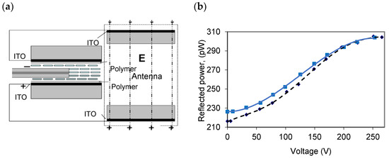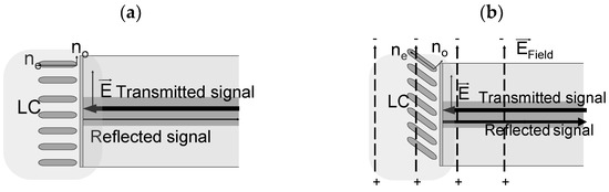 In the case of the proposed voltage sensor, the sensor head is immersed in planar-aligned LC, which is connected to an electric-field-sensing antenna (see Figure 7) [43]. The function of the sensor head is to monitor the optical properties of the LC. The sensor head surface plays the role of a broad-band mirror. Consequently, the incident light is reflected from the optical fiber surface, and the reflection coefficient varies depending on the applied voltage between the electrodes (see Figure 7b).