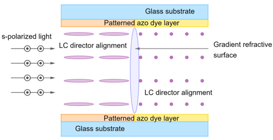 The optical path in LC devices highly depends on the surface properties and director alignment in the bulk. An example of a passive photonic device, in which a photoalignment layer induces gradient refractive interface, is shown in Figure 8. Here, s-polarized light propagating in the bulk of the cell refracts from the gradient refractive interface [44]. In other words, the incident s-polarized light beam from a waveguide is converted to the collimated beam within the LC bulk for further processing. Regarding p-polarized light, it undergoes total internal reflection at differently aligned domains.