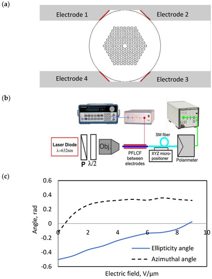 The idea behind the setup shown in Figure 9b is to control the state of polarization and obtain electrically tunable attenuation of the fiber. Here, a 7 cm long photonic crystal fiber (FLC FD4004N) with a diameter of ≈5 μm was obtained using photoalignment. The distance between electrodes was maintained at 126 μm. This means that states of the director are possible along the fiber length (see the video, the link is provided in the Data Availability Statement). The photonic liquid crystal fiber birefringent axis was aligned parallel to the glass plates. A conventional narrow band laser diode (λ = 632 nm) was used as the light source. A successive combination of the Glann–Thompson polarizer and a half-wave plate manifests change in the polarization state of the light. This system is supplemented by an objective for collimation of light. The cell was connected to the function generator with an amplifier. The application of an external electric field to the cell containing the fiber results in the continuous rotation of the optical axis and smooth change in the polarization state. The corresponding changes are measured by the Stokes polarimeter with a single-mode optical fiber.
