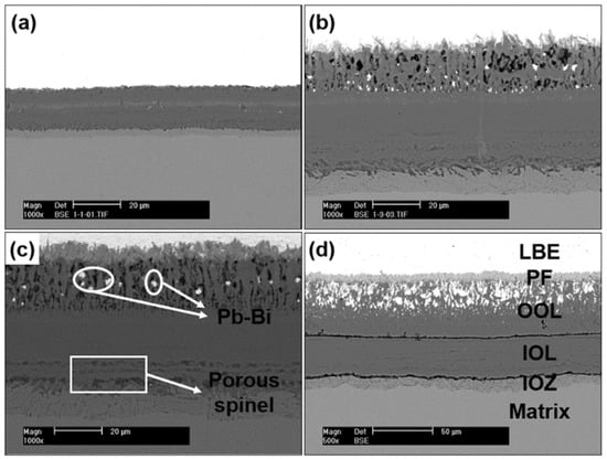 In oxygen-saturated LBE, the film generated by oxidation on T91 steel generally consists of three layers: the inner oxide zone (IOZ), the inner oxide layer (IOL), and the outer oxide layer (OOL) [5,60]. Figure 2 displays the effect of time on the SEM morphology of T91 oxide film [5]. The film thickness increases with time; however, the depth of IOZ does not grow with the experiment’s duration. At 2000 h, a fresh oxide film can be clearly observed on the OOL [5]. As the oxygen concentration in LBE decreases, the depth of the oxide film becomes progressively smaller, and there is an increase in Cr/Fe in Fe–Cr spinel. The three-layer magnetite/spinel/IOZ also becomes two-layer spinel/IOZ [60].