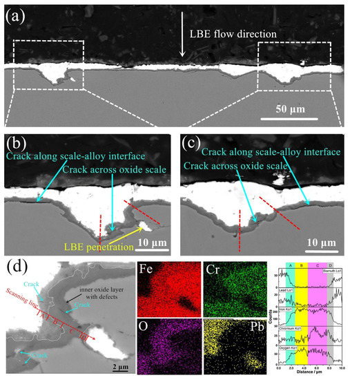 (a–c) BSE images of LBE flowing vertically through T91 at a rate of 5 m/s for 1000 h and (d) BSE images of the enlarged region in (b), with EDS mapping and line scan analysis. Reprinted with permission from Ref. [28]. 2021, Li, C.