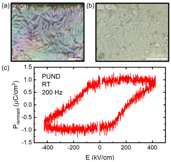 (a,b) Ferroelectric domain configuration of a 2 °C/h cooled crystal (a) and a 50 °C/h cooled crystal (b) revealed by chemical etching. (c) The P versus E hysteresis loop at room temperature measured using the PUND method.