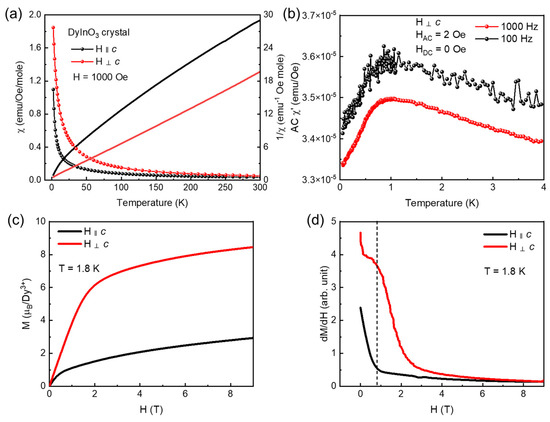 Figure 3a displays the anisotropic susceptibility data (measured in 1000 Oe field) of an h-DyInO3 single crystal as low as 1.8 K. No feature indicating a magnetic transition is observed, and it exhibits clear easy-plane anisotropy. The Curie–Weiss fitting of the susceptibilities in the high-temperature range (200 K to 300 K) produces μeff = 8.65 μB and TCW = −31.4 K when the susceptibilities are parallel to c and μeff = 12.22 μB and TCW = −22.4 K when the susceptibilities are perpendicular to c. The average of the high-temperature effective moments along two directions is close to the theoretical magnetic moment of a Dy3+ free ion: 10.48 μB. The Curie–Weiss fitting of the susceptibilities in the low-temperature range (5 K to 20 K) produces μeff = 4.96 μB and TCW = −0.89 K when the susceptibilities are parallel to c and μeff = 11.54 μB and TCW = −4.4 K when the susceptibilities are perpendicular to c. The reduction in the effective moment at low temperatures is due to the evolution of the thermal population of crystal electric field (CEF) levels, and similar behaviors have been commonly found in rare-earth magnets [18]. Therefore, the magnetic parameters from the low-temperature fitting should describe the ground state of Dy3+ in h-DyInO3 in a more precise manner. AC susceptibility versus temperature is measured as low as 0.1 K, and the data are shown in Figure 3b. A broad feature at 0.9 K with respect to AC susceptibility is observed, which may indicate spin freezing or a short-range magnetic correlation. Note that there is no significant chemical disorder in the h-DyInO3 crystal based on the X-ray study. Therefore, the observed possible spin freezing may be related to ferroelectric domain interfaces and coherent Z3 topological defects, which are unconventional cases. Another possible scenario is that spin freezing here is caused by spin frustration instead of structural defects, which has been reported in many geometrically frustrated magnets [19,20]. Consistent with the susceptibility data, isothermal magnetization versus magnetic field M(H) data at 1.8 K (Figure 3c) parallel to c and perpendicular to c exhibit a saturation tendency at around 2.9 μB and 8.5 μB, respectively, which exhibits easy-plane anisotropy. Interestingly, as shown in Figure 3d, the derivative of M(H) perpendicular to c shows a broad peak at around 1 T. This feature could be a CEF-level evolution, i.e., a change in CEF-level occupancies due to Zeeman splitting. At low temperatures and the zero field, the Dy3+ spin state is represented by the lowest CEF level, which is likely an S = 1/2 doublet because Dy3+ is a Kramer ion. Upon heating, the thermal excitation overcomes the energy gap between the ground state and excited states such that the spin state of Dy3+ gradually evolves into the free ion situation, which is experimentally evidenced by the broad peak in the magnetic heat capacity (Figure 4b) around 15 K, as well as the bending of the inverse susceptibility curve (Figure 3a) at that temperature. In a similar manner, applying the field introduces Zeeman energy, which could cause a CEF-level evolution as well. Note that the magnetic field of the anomaly in M(H) (~1 T) has a similar energy scale (estimated to be ~1 meV for Dy3+), with the characteristic temperature of CEF-level evolution (~15 K) obtained from heat capacity and inverse susceptibility.