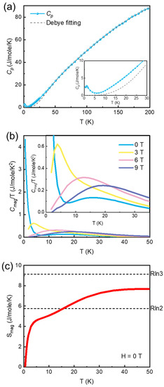 (a) Heat capacity and Debye fitting at 0 T. (b) Magnetic heat capacity over temperature as a function of temperature at 0 T, 3 T, 6 T, and 9 T. (c) Magnetic entropy as a function of temperature at 0 T. The horizontal dashed lines show theoretical magnetic entropy values of S = 1/2 (Rln2) and S = 1 (Rln3).