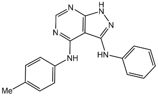 Chemical diagram for N4-(4-methylphenyl)-N3-phenyl-1H-pyrazolo[3,4-d]pyrimidine-3,4-diamine (1).