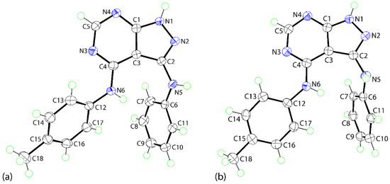 The molecular conformations in the α- and β-forms resemble each other but nonetheless present distinct features. The molecular structures are illustrated in Figure 2 and key geometric parameters are collated in Table 2. In the α-form, the nine atoms of the fused 1H-pyrazolo[3,4-d]pyrimidine system exhibit a r.m.s. deviation of 0.0308 Å with the maximum distortions to either side of the least-squares plane through the ring being 0.0414(10) for the N3 atom and 0.0411(12) for atom C3. Appended at the C2- and C4-positions are phenylamino and p-tolylamino substituents, respectively; the N5 and N6 atoms lie 0.1883(19) and 0.1248(18) Å to either side of the fused ring, respectively. The dihedral angles between the fused ring and the phenylamino and p-tolylamino substituents are 70.37(4) and 42.21(4)°, respectively, and the dihedral angle between the pendant rings is 85.15(4)°, indicating a near to orthogonal relationship; to a first approximation, the rings lie to the same side of the fused ring system. The relative arrangement of the substituents facilitates the formation of an intramolecular phenylamino-N–H···π(phenyl) contact; geometric details are given in Table 3.