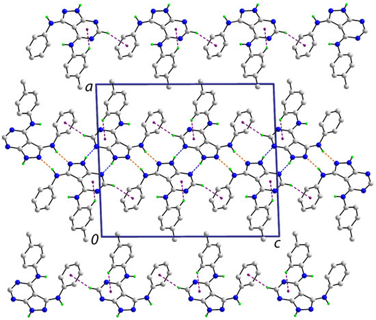 Despite both the α- and β-forms crystallising with the same space group symmetry, distinctive modes of supramolecular association are apparent in their crystals. While, the same pattern of phenylamino-N–H···N(pyrazolyl) and pyrazolyl-N–H···N(pyrimidyl) hydrogen bonds noted in the α-form persist in the β-form, in the latter, the phenylamino-N–H···N(pyrazolyl) hydrogen bonds are formed between molecules assembled along the c-axis, i.e., generated by glide-symmetry, rather than the 21-screw symmetry in the α-form. In the crystal of the β-form, supramolecular layers are formed in the bc-plane. Within layers are p-tolyl-methyl-C–H···π(pyrimidyl) and π(pyrimidyl)···π(pyrimidyl) contacts, Table 3. The layers stack along the a-axis without directional interactions between the phenylamino rings that project into the inter-layer region; a view of the unit-cell contents is shown in Figure 6.