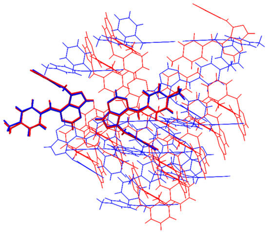 A comparison of the molecular packing between the α- (red image) and β- (blue) polymorphs, showing two pairs of molecules (highlighted as bold tubes) out of 15 fit within the 20% tolerance criterion.