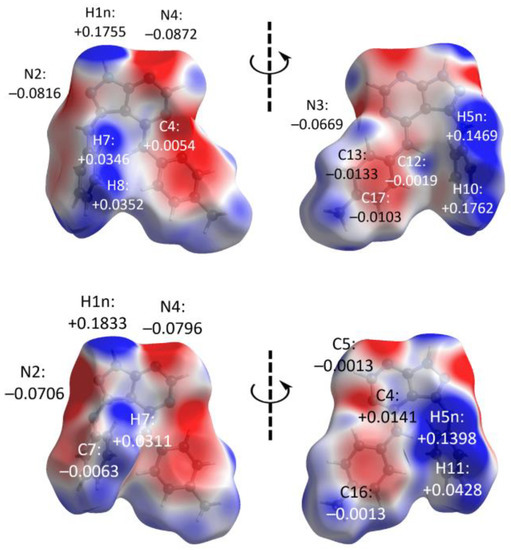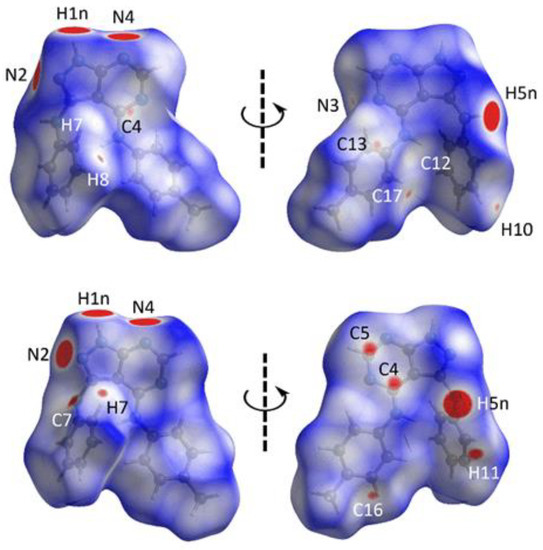 A Hirshfeld surface analysis was performed to further comprehend the nature of the contacts in the crystals of the polymorphs. The analysis shows that the α- and β-polymorphs adopt relatively different contact features as revealed through the corresponding dnorm-surface mappings, Figure 8. In particular, the α-polymorph exhibits four intense red spots stemming from N1–H1n···N4 and N5–H5n···N2 contacts with the corresponding contact distances being 1.88 and 1.98 Å, separations significantly shorter than the sum of their van der Waals radii (ΣvdW) of 2.64 Å (Table 4), while the remaining features are weak red spots of diminished intensity which comprise C8–H8···C17 (dnorm = 2.71 Å vs. ΣvdW = 2.79 Å), C10–H10···N3 (dnorm = 2.58 Å vs. ΣvdW = 2.64 Å), π(C4)···π(C13) (dnorm = 3.35 Å vs. ΣvdW = 3.40 Å), C7–H7···π(C12) (dnorm = 2.77 Å vs. ΣvdW = 2.79 Å) and C13–H13···π(C5) (dnorm = 2.77 Å vs. ΣvdW = 2.79 Å). As for the β-polymorph, the same intense red spots as for the α-form are evident, but with N1–H1n···N4 and N5–H5n···N2 having different dnorm-distance of 1.86 and 2.02 Å, respectively. Besides, moderately intense, rather than faint red spots noted for the α-form, due to C11–H11···π(C7) (dnorm = 2.60 Å vs. ΣvdW = 2.79 Å), π(C4)···π(C5) (dnorm = 3.27 Å vs. ΣvdW = 3.40 Å) and C7–H7···π(C16) (dnorm = 2.69 Å vs. ΣvdW = 2.79 Å).