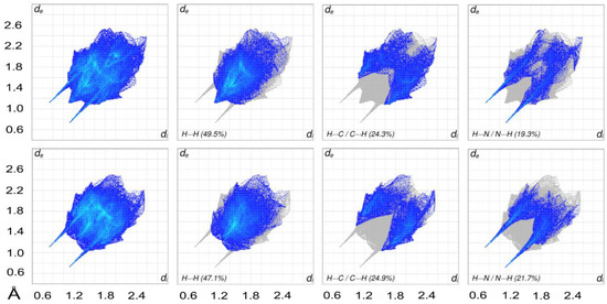 The overall two-dimensional fingerprint and decomposed plots delineated into the major contacts for α- (top) and β- (bottom) polymorphs.