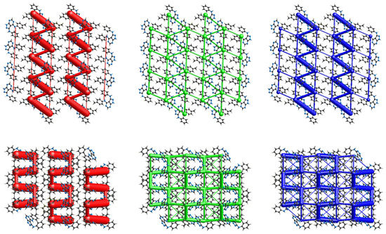 Perspective views of the electrostatic energy (red), dispersion force (green) and overall energy frameworks (blue) for the α- (top) and β- (bottom) polymorphs. The cylindrical radius is proportional to the relative strength of the corresponding energies and they were adjusted to the same scale factor of 150 with a cut-off value of 8 kJ/mol within a 2 × 2 × 2 unit-cells.