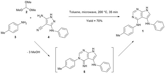 Compound 1 was prepared and characterised as described in the literature [25]. The three-component reaction of trimethyl orthoformate (2), p-toluidine (3), and 5-amino-3-phenylaminopyrazole-4-carbonitrile (4) in toluene under controlled microwave irradiation at 200 °C for 35 min. (closed-vessel mode in a Discover SP microwave reactor, CEM, Matthews, NC, USA) resulted in the formation of compound 1, which was isolated in a 70% yield (Scheme 1). The reaction was proposed to proceed via the initial pyrimidine ring closure with the formation of intermediate 5 undergoing the Dimroth rearrangement to the more thermodynamically stable 1. Product 1 was purified by the recrystallisation from methanol and pure compound 1, which has NMR spectral characteristics matching the reported ones [25], was used for growing crystals for crystallographic analysis. The crystals were obtained at ambient temperature by slow evaporation of different solvents (i.e., methanol, ethanol, n-propanol and isopropanol) from saturated solutions of analytically pure samples of 1.
