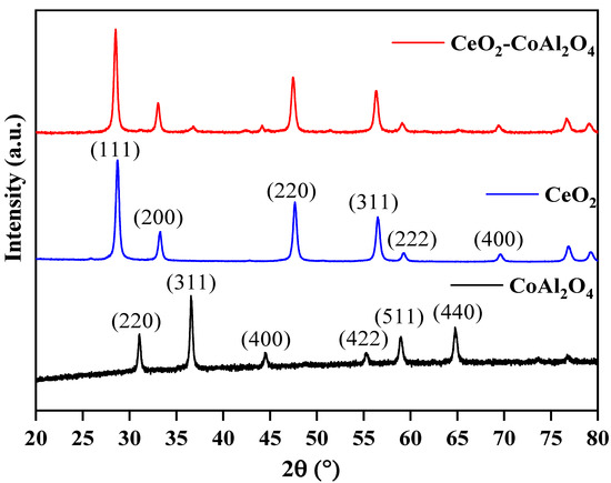 XRD patterns: pure CoAl2O4, pure CeO2, and CeO2-CoAl2O4 heterostructures.