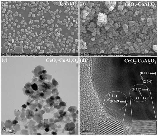 (a,b) Scanning electron microscopy (SEM) images of CoAl2O4 and CeO2-CoAl2O4, and (c,d) high-resolution transmission electron microscopy (HR-TEM) images, CeO2-CoAl2O4 sample.