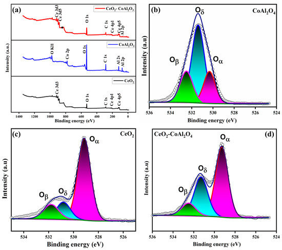 (a–d) XPS survey spectra and O1s spectra of CoAl2O4, CeO2, CeO2-CoAl2O4 samples.