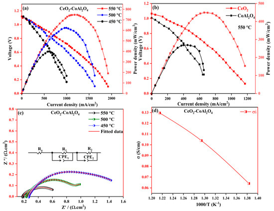 To further analyze the electrochemical performance of pure CoAl2O4, pure CeO2, and CeO2-CoAl2O4 composite, EIS was performed at different temperatures of 550–450 °C under H2/air conditions. The fabricated devices were operated under an open circuit voltage condition (where OCV is the voltage of the cell in a steady state). Figure 5a,b shows the I-V and I-P characteristics of fabricated fuel cell devices under H2/air conditions. The CoAl2O4 sample delivers a PPD of 142 mW/cm2, pure CeO2 exhibits a PPD of 420 mW/cm2 at 550 °C, and the PPD of 758 mW/cm2 of the CeO2-CoAl2O4 composite was observed at 550 °C under H2/air. The obtained high PPD performance of CeO2-CoAl2O4 is comparable with the results of state-of-the-art SOFC electrolytes using pure CeO2 as an electrolyte membrane, which means that by constructing heterostructures between CeO2 and CoAl2O4, this may cause enhanced oxide ion conductivity resulting in higher fuel cell performance. The higher PPD in CeO2-CoAl2O4 can be ascribed to the enhanced oxide ion conductivity as well as defects produced between the two different fluorite and spinel structures. The structural deformation at the interface because of the weaker lattice provides a channel for fast oxide ion transportation. The weaker bonds at the interface are enriched with oxygen defects, which were also verified by the XPS O1s spectra of the CeO2-CoAl2O4 sample that may also cause enhanced oxygen vacancies as a result of ion mobility at the interface. Including high PPD, the fabricated fuel cell devices also demonstrate a higher OCV of >1.00 V, even at a low 450 °C temperature; moreover, this verifies that the constructed fuel cell device has the potential to maintain a voltage over 1.00 V even at low temperatures. With higher Power, the prepared composite cathode CeO2-CoAl2O4 also demonstrates high OCVs above 1.00 V, even at a low temperature of 470 °C, certifying that the constructed electrolyte has the potential to maintain OCVs at low operating temperatures.