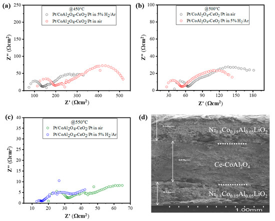 (a–c) EIS analysis of CeO2-CoAl2O4 in configuration of Pt/CeO2-CoAl2O4/Pt in air and 5% H2/95%Ar at 450 °C–550 °C and (d) the cross-sectional SEM image of fuel cell with configurations of Ni0.80Co0.15Al0.05LiO2/CeO2-CoAl2O4/Ni0.80Co0.15Al0.05LiO2 after fuel cell performance measurements.
