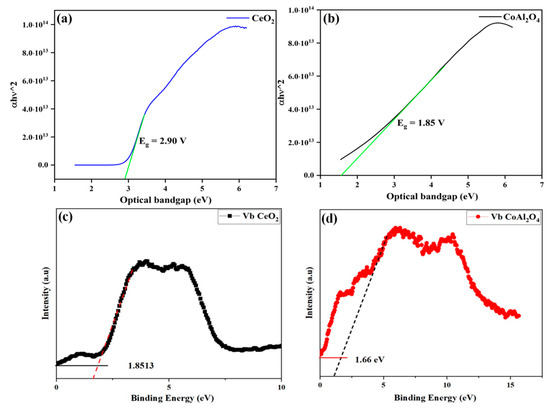 An optical study is an important key to analyzing the semiconducting nature of the prepared samples. For this reason, CoAl2O4 and CeO2 samples were tested by UV-Vis spectroscopy to evaluate optical bandgap. The optical bandgap of pure CoAl2O4 and CeO2 samples and Vb values are presented in Figure 7a–d. Moreover, the optical bandgap of the prepared samples was calculated using the relation as given below [38]: