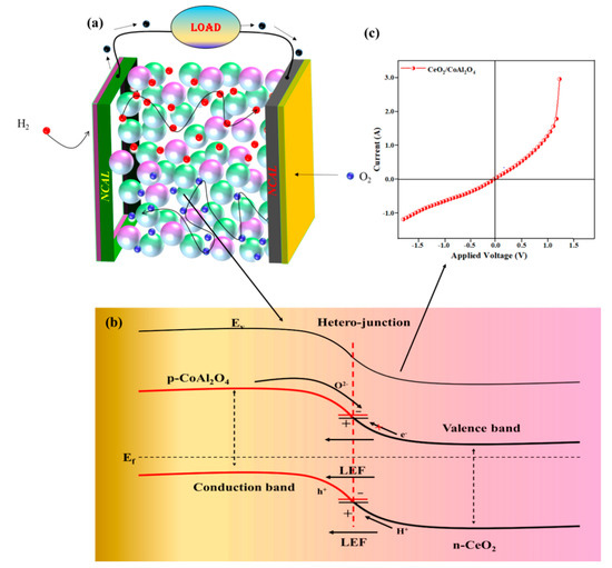 Since the discovery of semiconductor-based fuel cells, electronic conduction always seems to be unfavorable, which strictly follows the concept of traditional knowledge of zero electronic conduction in the electrolyte layer to realize the fuel cell operation. However, our approach of heterojunction CeO2-CoAl2O4 revealed better cell performance and feasible oxide ion conductivity with higher OCV under low operational temperatures, which may be because of the incorporation of P-type CoAl2O4 into the n-type semiconductor CeO2 to attain the composite heterostructure as confirmed by the HR-TEM images of the formation of the composite heterostructure. Two different materials with different charge characteristics combine to build a p-n junction at the particle levels due to unbalanced charge distribution at the interface. Furthermore, charge redistribution at the interface establishes a space charge region that further creates a built-in electric field (BIEF), consequently excelling the ions transportation and suppressing the electronic conduction in the proposed heterojunction of CeO2-CoAl2O4 [20,25,29,39]. To construct the heterojunction, energy bandgap and valence band position were evaluated using the UV-Vis (Kubelka—Munk function) and XPS Vb spectra, as depicted below. The bandgap of 3.2 and 2.4 eV and the position of the valence bands of 6.5 and 7.3 eV correspond to the CeO2 and CoAl2O4, respectively. Furthermore, the Conduction band value was determined using the following equation Vb = Vc + Eg, giving the values of 1 eV and 0.4 eV. These values verify the existence of the p-n heterojunction at the particle level, and the junction mechanism with the fuel cell diagram is shown in Figure 8a,b. Additionally, the response current measurement of the fabricated device p-n junction device under a bias voltage was also performed to analyze the p-n junction mechanism in the fabricated device. In Figure 8c, the p-n junction-based SOFC has a diode rectification characteristic under DC bias voltage, exhibiting the formation of the built-in electric field in the constructed interfaces. The rectification response of the p-n junction CeO2-CoAl2O4 device is apparently stronger and the recorded current is also much lower values, which is feasible for the heterostructure electrolyte design, as discussed in the literature. The response current under negative applied voltage can notify that the constructed heterojunction can block electrons. So, the p-n junction application with the Al doping as well as taking part in the heterostructure base CeO2-CoAl2O4 sample may significantly strengthen the electron blockage capability of electrolyte-based components and exhibits a more effective space charge region. The CoAl2O4 plays an important role because of its ultrawide bandgap as well as insulating properties. Therefore, a distinct energy band structure and interfacial contact is formed in the CeO2-CoAl2O4 SOFC device, resulting in enhancing oxide ion conductivity.