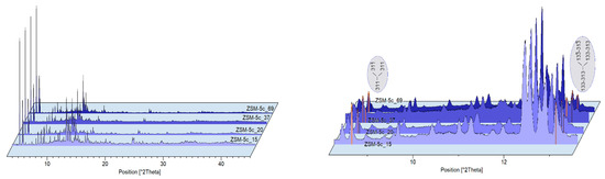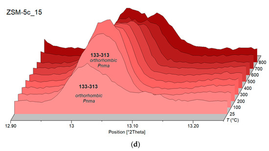 Peak indexing of the collected powder diffraction pattern at RT shows that for sample ZSM-5c_15 the characteristic doublets of the monoclinic polymorph peaks (i.e., [311], [−313], and [313]) are not fully resolved. In fact, the peaks centred at about 8.5 and 13.1° 2θ are broader and more intense than those of the other samples due to a possible convolution of more peaks (Figure 1).