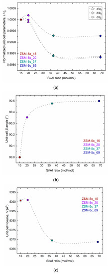 An attempt at structural refinement in the monoclinic P21/n space group gives a β angle very close to 90° with relatively unsatisfactory refinement agreement factors (i.e., Rwp = 18.69%, Rp = 14.43%, RF = 18.70% and RF2 = 23.12%). For these reasons, the Rietveld refinement of the ZSM-5c_15 sample was performed in the orthorhombic Pnma space group at each temperature studied. The refinement agreement indices, as reported in Table 2 for the structure refinement at RT, result improved and comparable to those of the other samples. The structure of ZSM-5c samples with higher Si/Al ratio (ZSM-5c_20, 37 and 69) was successfully resolved by refinement in the monoclinic P21/n space group (Table 2). Considering that the activation procedure is the same for all the samples studied, the structural differences are mainly due to differences in their chemical composition (i.e., different Al content). The Si/Al ratio plays a key role in the formation of defects in the zeolite framework and consequently in its structural properties. As highlighted in the case of ZSM-5c single-crystals [48], high Al contents within the zeolite framework cause internal stresses that mainly affect the orientation of the ZSM-5 twin domains. This is reflected in the variation of the β angle, which changes from 90° (orthorhombic) to higher values as a function of increasing Si/Al ratio, thus determining increasing degrees of “monoclinicity”. Figure 2 shows the variation of the normalized lattice parameters, the β angle, and the unit-cell volume as a function of increasing Si/Al ratio. Both the normalized a and c lattice parameters decrease with a similar rate of variation as a function of the Si/Al ratio, while the unit-cell b-axis is the less affected by the different chemical composition. Indeed, Figure 2b clearly shows a close relationship between the Al content and the degree of monoclinicity of activated ZSM-5 zeolites, with the β angle ranging from 90 to 90.49°.