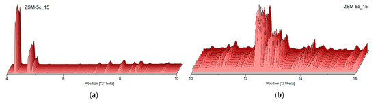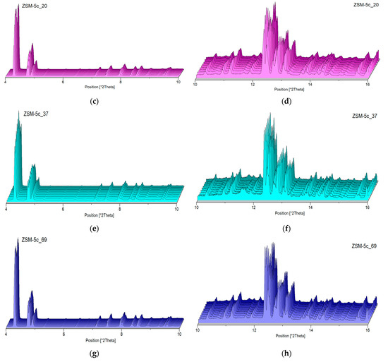 The evolution of the powder patterns upon heating is shown in Figure 4 (i.e., details of the high temperature patterns in the 3–10° 2θ and 10–20° of 2θ ranges, respectively). No evidence of crystallinity loss is observed within the investigated temperature range, confirming the high thermal stability typically exhibited by ZSM-5 zeolites.
