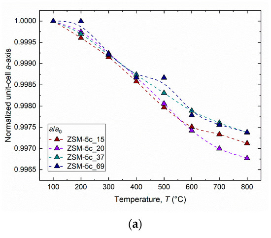 Temperature dependence evolution of the normalized lattice parameters ((a) a/a0, (b) b/b0 and (c) c/c0) for the investigated ZSM-5c samples.