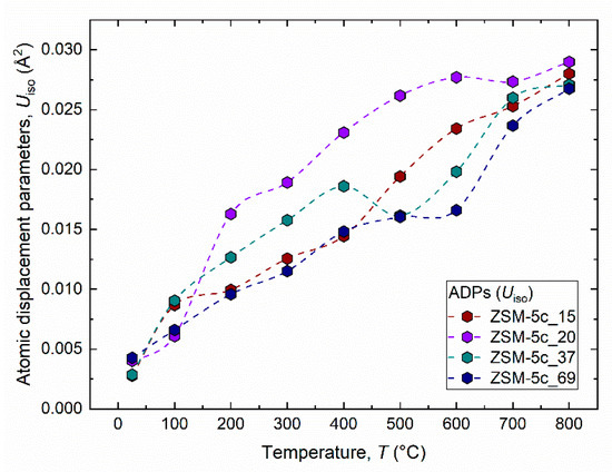Figure 7 shows the evolution of the atomic displacements parameters for the cations hosted at the tetrahedral sites between 100 and 800 °C for all the ZSM-5c samples. As reported in the refinement strategy section, the ADPs were constrained to be isotropic and to change equally for the 12 tetrahedral sites in the unit-cell. The ADPs increase continuously up to the maximum temperature. Since no extraframework species are present in the zeolite pore system, the evolution of ADPs with temperature must be attributed exclusively to atomic thermal motion.