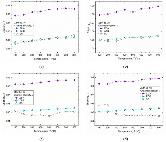 No significant variations were observed in the evolution of the ellipticity parameter. In fact, both sinusoidal (ZZ-A and ZZ-B) and straight channels (Figure 8) do not show any evident variation in shape and geometry between 100 and 800 °C, thus proving that the zeolitic framework does not undergo any relevant distortions until the end of the thermal treatment. More specifically, the evolution of the sinusoidal channels (i.e., for both entrance and exit) appears more regular than that of the straight one. Moreover, the ellipticity increases progressively from 100 to 800 °C for all the analyzed samples, although at a low rate. The samples with the lowest Si/Al ratio are characterized by straight channels that follow similar trends: the ellipticity increases progressively (i.e., the point at 500 °C point is not taken into account) up to 800 °C, unlike the samples with the highest Si/Al ratio.