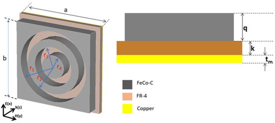 Figure 1 shows the schematic of the proposed MA, featuring the optimized design for the unit cell. The structure comprises three layers: FeCo/graphite nanosheets (FeCo-C) whose shape looks like a flat sheet with two punched-in rings at the top, a middle layer of Flame Retardant 4 (FR-4), and a continuous copper plate at the bottom. In our simulation, we used a relative permittivity of FR-4 of 4.3, with a loss tangent of 0.025, and employed the copper layer with a conductivity of 5.8 × 107 S/m. We utilized the polyhedral FeCo/graphite nanosheet material, whose frequency-dependent complex permittivity and permeability were determined experimentally by Xiaogang Su et al. [20], as indicated in Figure 2.