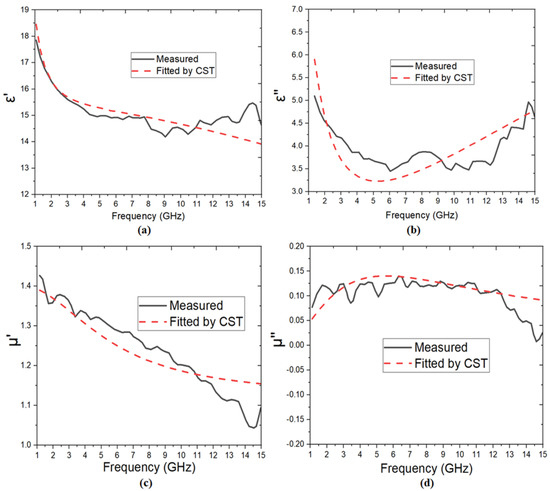 Frequency-dependence of the complex permittivity and permeability of FeCo-C. (a) Real ε′ and (b) imaginary ε″ parts of the permittivity. (c) Real µ′ and (d) imaginary µ″ parts of the permeability. The corresponding measured data are employed from [20] for the fitting.
