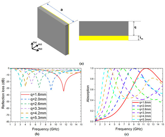 As the initial step, we examined the reflection-loss properties of FeCo-C material, which was utilized on a copper plate [Figure 3a]. The thickness of the FeCo-C layer was changed gradually from 1.6 to 5.3 mm in Figure 3b,c. That of the copper plate was tm = 0.036 mm. Figure 3b,c display the simulated reflection loss and absorption spectrum, respectively, of FeCo-C according to the layer thickness, which was backed by the copper plate. Our simulated results are in accordance with the reported results in [20], which show only one absorption peak for the continuous FeCo-C layer.