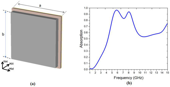 We used the CST Microwave Studio software [21] to conduct the simulation, employing the frequency domain solver in a frequency range from 1 to 15 GHz. To impose the periodic boundary conditions, we utilized the x- and y-direction. The absorption was calculated by using formula , where and were the reflection and transmission, respectively. In our design, the bottom layer was composed of a continuous copper plate, resulting in zero transmission in the microwave region, and thus the absorption simply becomes .