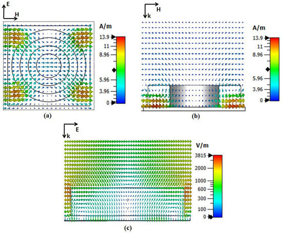 As shown in Figure 6, the strongest absorption peaks are located at 9.4 and 12.5 GHz. Therefore, the distributions of the electric and magnetic fields at these frequencies are presented in Figure 7 and Figure 8 to clarify the nature of absorption. Figure 7a,b show that of the magnetic field in the (E, H) and (H, k) planes, respectively, at the lower absorption frequency of 9.4 GHz. The corresponding one for the electric field in the (E, k) plane is in Figure 7c. It can be observed that the magnetic field is strongly excited at the corners of the MA structure. Specifically, the magnetic dipoles are seen along the direction of the incident H-field with electric half vortices at the same positions. The observed phenomena suggest that the absorption mode at 9.4 GHz is due to a magnetic-dipole Mie-resonance, caused by the dielectric resonator [22,23,24,25,26,27]. Figure 8 presents the distributions of the electric and magnetic fields in different planes at 12.5 GHz. The MA also exhibits the magnetic-dipole Mie-resonance, as indicated by the strong magnetic dipoles along the H-direction and the electric half vortices in the (E, k) plane. However, the locations of the magnetic dipoles at 12.5 GHz differ from those at 9.4 GHz. As shown in Figure 8, the induced magnetic dipoles are distributed in both center and outer edges of the MA structure, which are, of course, parallel to the H-direction.