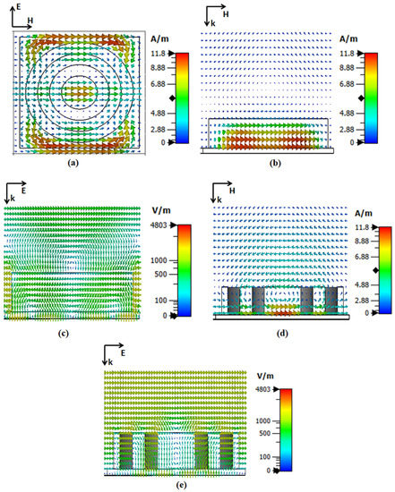 Electric and magnetic field distributions of the MA structure at a frequency of 12.5 GHz. (a) Magnetic field in the (E, H) plane. (b,d) Magnetic field in the (H, k) plane. (c,e) Electric field in the (E, k) plane.