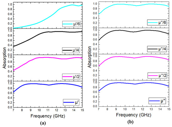 We also investigated the role of the real and imaginary parts of the complex permeability (μ′ and μ″) on the absorption mechanism. The absorption characteristics of the MA structure according to the values of μ′ and μ″ were simulated, as shown in Figure 10. Similarly, to the reduction in the real part of the permittivity, lowering the μ′ value causes a shift in the absorption spectrum toward a higher-frequency range. However, the results in Figure 10b indicate that reducing the imaginary-part μ″ value does not significantly change the absorption spectrum of the MA. The nearly unchanged absorption, according to the imaginary part μ″, is due to its small value. Therefore, it can be concluded that the loss in our proposed MA is dominated by the imaginary part ε″ of FeCo-C.