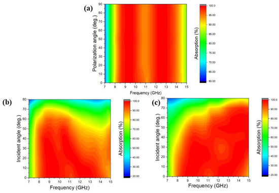 To evaluate the performance of the proposed MA structure, we also investigated the absorption spectra by varying the incident angle and polarization of the incoming EM wave. We found that the absorption spectrum was largely unaffected by the change in the polarization angle owing to the inherent symmetry of the structure, as shown in Figure 11a. However, the absorption of the MA is influenced by the incident angle, as indicated by a reduction in both the absorption magnitude and bandwidth [see Figure 11b,c]. Nonetheless, the proposed MA still reveals a good absorption property for both transverse-electric (TE) and transverse-magnetic (TM) polarization even at large incident angles. Specifically, for the TE polarization, the absorption decreases as the incidence angle increases from 0 to 55° but remains higher than 90% in a frequency range of from 8 to 11.1 GHz, as shown in Figure 11b. Similarly, in the TM mode, the absorption is maintained to be higher than 90% in a frequency region of from 9.5 to 14.6 GHz for incident angles up to 55°, as demonstrated in Figure 11c. As illustrated in Figure 11b,c, the absorption characteristics of the structure exhibit a more favorable behavior in the TM mode compared to the TE one. This observation can be rationalized by considering the orientation of the incident magnetic field. In the TM mode, the magnetic field direction remains fixed under the variation in the incident angle, while, in the TE one, the direction is no longer parallel to the sample plane and is deviated from it. The resonance mechanism of the MA structure is based on the magnetic-dipole Mie-resonance, indicating that the magnetic resonance of the MA structure is weakened as the angle of incidence increases. Consequently, sustaining the absorption in the TE mode is not as effective as it is in the TM one. These results reveal the high performance of the proposed MA, which is insensitive to the polarization of the incoming EM wave and is highly stable under the oblique incidence.