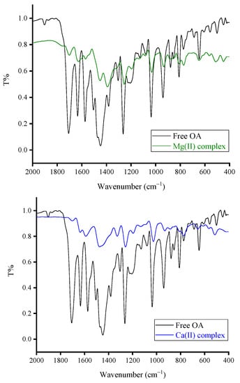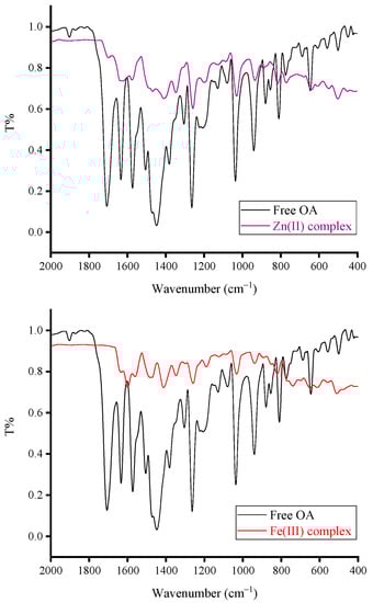- Disappearance of the band due to the ν(C=O)COOH vibrations. This band resonated at 1710 cm−1 in the FT-IR spectrum of free OA, but it was absent in the FT-IR spectra of Fe(III), Zn(II), and Ca(II) complexes. The intensity of this band was greatly decreased in the spectrum of the Mg(II) complex;