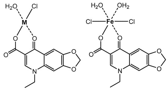 These characteristic shifts observed in the FT-IR spectra of OA complexes suggested that the OA molecule captured the metal ions using the oxygen atoms of the carboxylic group (–COOH) and C=O group of the pyridone ring [,]. The oxygen atom of the –COOH group forms an ionic bond with the metal ion, whereas the oxygen atom of the pyridone C=O group forms a coordination bond with the metal ion, as described in Figure 4.